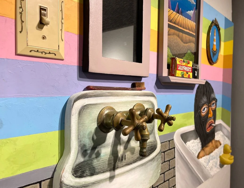 Brad Chapman Bleau, Scrub-a-dub-dub (detail), acrylic and junk on wood, 36" x 24" 2022. Courtesy of the artist.